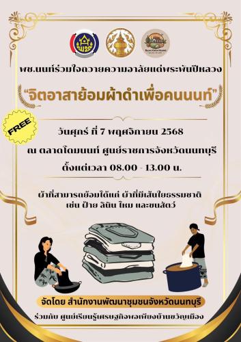 วันที่ 6 พฤศจิกายน 2568 เวลา 09.00 น. นางประภา ปานนิตยกุล พัฒนาการจังหวัดนนทบุรี มอบหมายให้ ผู้อำนวยการกลุ่มงาน พร้อมด้วยเจ้าหน้าที่พัฒนาชุมชนจังหวัดนนทบุรี ลงพื้นที่ประชาสัมพันธ์เชิญชวนผู้ที่สนใจเข้าร่วมกิจกรรม พช.นนท์ร่วมใจถวายความอาลัยแด่พระพันปีหลวง “จิตอาสาย้อมผ้าดำเพื่อคนนนท์” ซึ่งกิจกรรมดังกล่าวจัดขึ้นในวันศุกร์ที่ 7 พฤศจิกายน 2568 ตั้งแต่เวลา 08.00 – 13.00 น. ณ ตลาดโดมนนท์ ศูนย์ราชการจังหวัดนนทบุรี โดยสำนักงานพัฒนาชุมชนจังหวัดนนทบุรี ร่วมกับ ศูนย์เรียนรู้เศรษฐกิจพอเพียงบ้านขวัญเมือง กิจกรรมภายในงานประกอบด้วย การย้อมผ้าสีดำ เพื่อร่วมน้อมรำลึกถวายความอาลัยสมเด็จสมเด็จพระนางเจ้าสิริกิติ์ พระบรมราชินีนาถ พระบรมราชชนนีพันปีหลวง ผ้าที่สามารถนำมาย้อมได้ ได้แก่ ผ้าที่มีเส้นใยธรรมชาติ เช่น ผ้าฝ้าย ผ้าลินิน ผ้าไหม และผ้าขนสัตว์